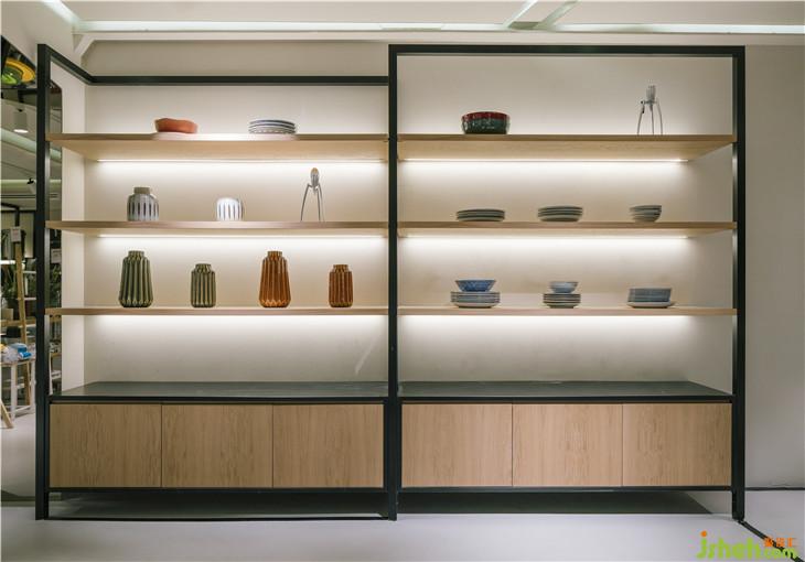 往里走,這個地方被分成兩個高度。 在這些高度內(nèi),金屬條貫穿周邊,形成木質(zhì)和玻璃擱板的支撐。