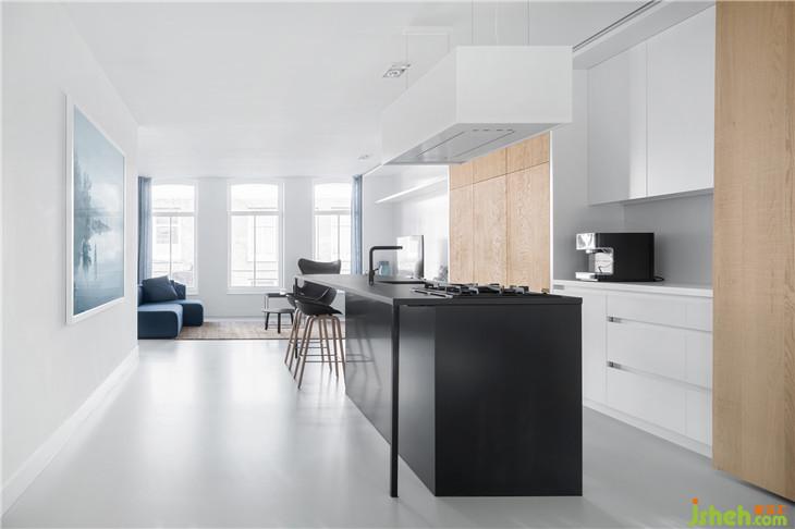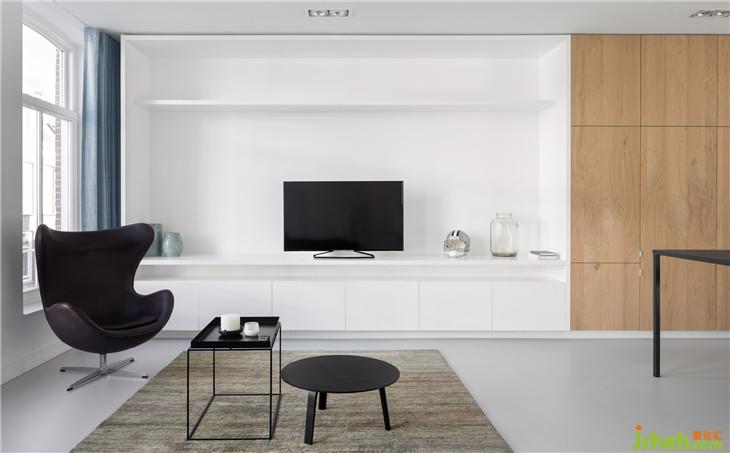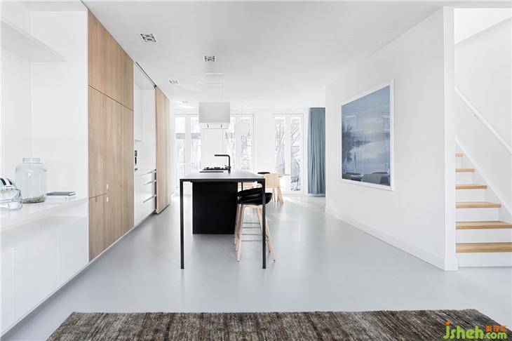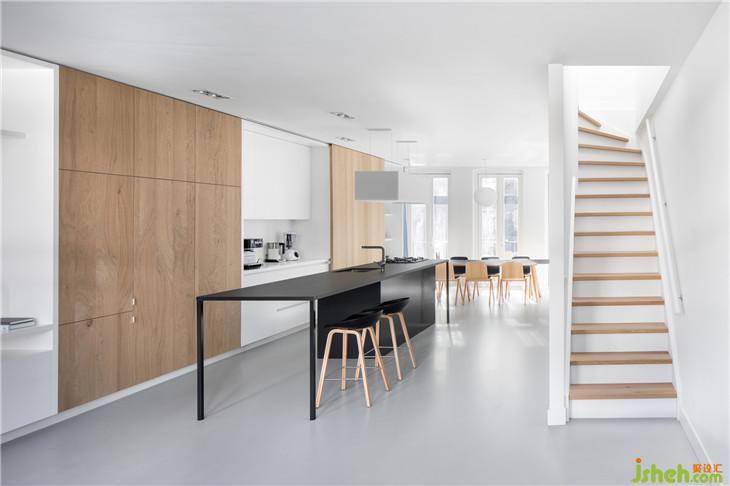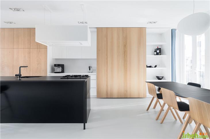 包括櫥柜,電視柜和專門(mén)設(shè)計(jì)的廚房,都可以可以通過(guò)大型橡木墻完全隔離。 一個(gè)對(duì)比鮮明的黑色廚房被放置在這個(gè)空間的中心。