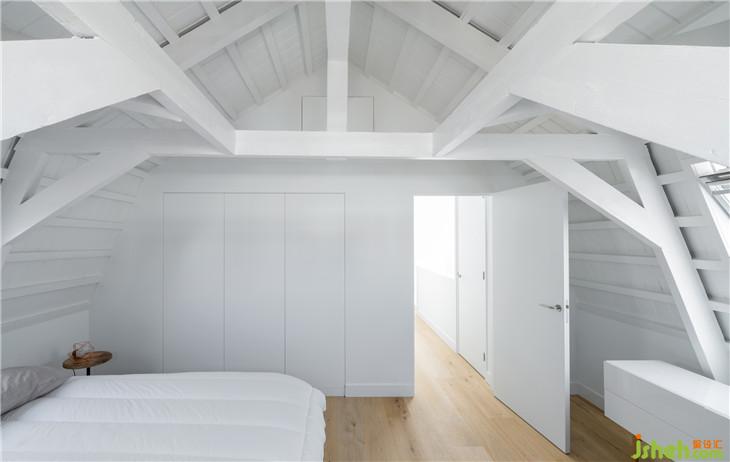 閣樓被改成新的布局,實(shí)現(xiàn)了兩間臥室和一間浴室多樣空間。 除了橡木地板外,屋頂結(jié)構(gòu)完全采用白色裝飾,浴室內(nèi)置浴缸和LG HiMacs定制設(shè)計(jì)的洗臉盆。