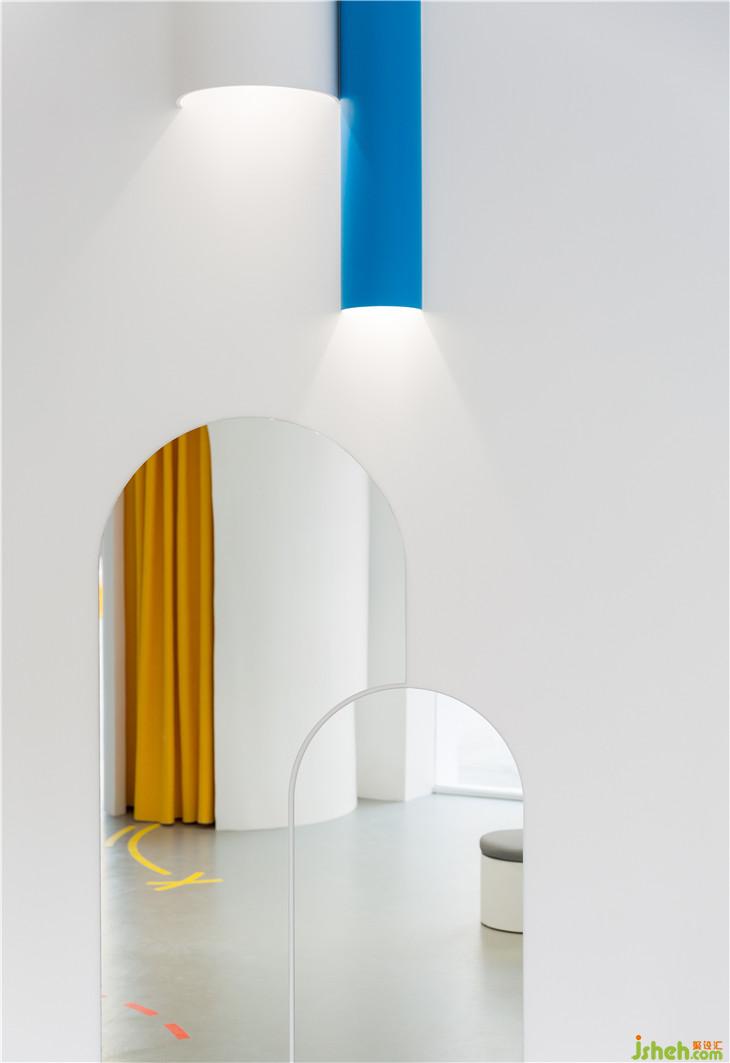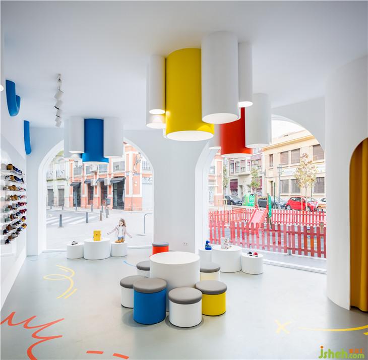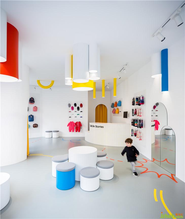 “小故事”概念鞋店不論從外觀還是室內(nèi)上都有著強(qiáng)烈的吸引力,不僅為孩子們提供了連續(xù)的游戲空間,還使商品得到了充分的展示。室內(nèi)的燈光從天花板上的管道內(nèi)散發(fā)出來(lái),將人們的目光不斷吸引到產(chǎn)品上來(lái)。
