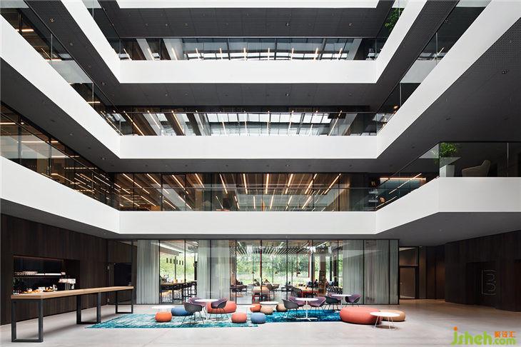 進(jìn)入大樓,來(lái)訪的客人會(huì)發(fā)現(xiàn),這里遠(yuǎn)不止一個(gè)開放的辦公空間。AEB一直以來(lái)非常注重工作上同事之間的溝通與交流,為能夠在設(shè)計(jì)中體現(xiàn)這種企業(yè)文化,我們盡量擴(kuò)大了視覺(jué)空間感,從而讓不同功能空間互相具有連貫性。從前臺(tái),目光經(jīng)過(guò)中心休息區(qū),繞過(guò)一片玻璃隔斷進(jìn)入接近大堂的員工食堂。每一層靠近中庭的陽(yáng)臺(tái)互相錯(cuò)落,賦予了強(qiáng)烈的層次感。這些公共陽(yáng)臺(tái)為員工提供著休閑討論區(qū),無(wú)框玻璃和玻璃欄桿柔和地沿著走廊伸延,讓員工和客人更好地欣賞中庭和室外的景象。開放式的中庭設(shè)計(jì)使得多種多樣的功能區(qū)域在視覺(jué)上融為一體,訪客可從第一層的大堂看到第四層的辦公空間。這種設(shè)計(jì)方式充分地體現(xiàn)了AEB的文化,無(wú)論是團(tuán)隊(duì)辦公室還是研討會(huì)議室,都讓這里的員工能夠更加專注地進(jìn)行工作,同時(shí)交流也更加放松、快捷。
