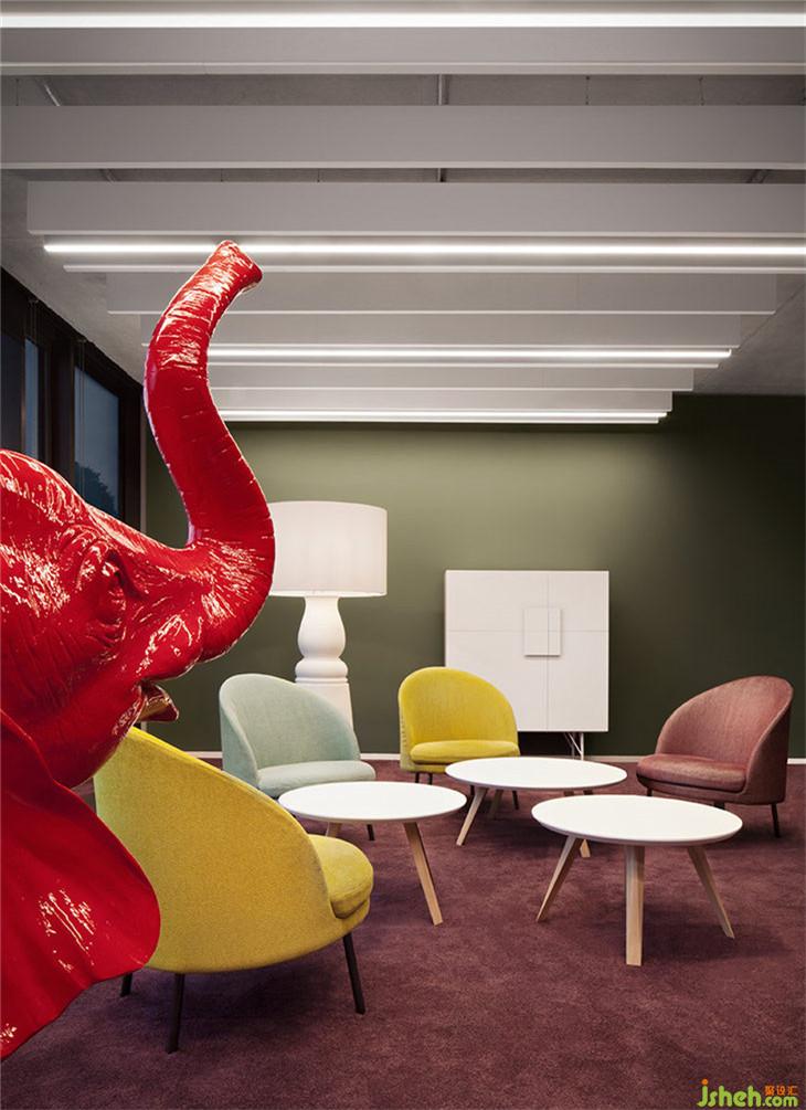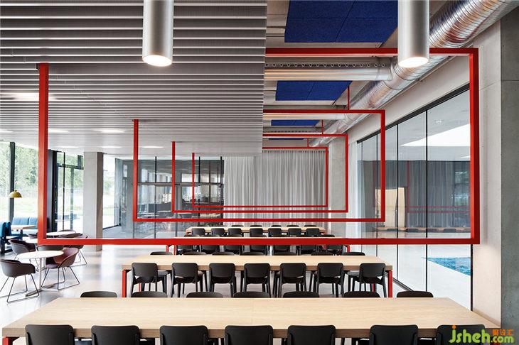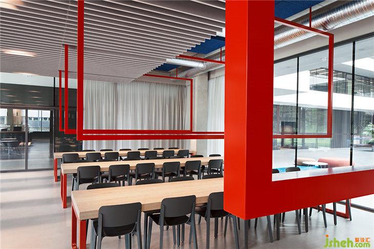 員工餐廳不僅是享用午飯的地方,又是員工之間的交流最多的地點(diǎn)之一。為營(yíng)造不同風(fēng)格的就餐氛圍,餐廳布置了多人使用的大長(zhǎng)桌、小隔間、酒吧高桌以及三人用小圓桌等不同餐位,讓員工根據(jù)自身的需求選擇就餐環(huán)境。紅色的鐵質(zhì)框架在食堂餐桌上方,在沒(méi)有任何空間障礙的情況下有效劃分空間;黃色的簡(jiǎn)約吊燈和藍(lán)色的吊頂面板與紅色框架相呼應(yīng),為餐廳賦予一些活力。