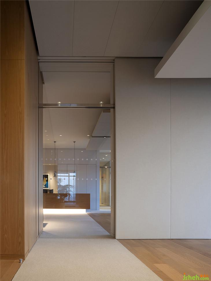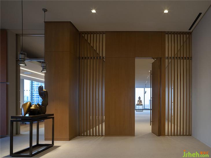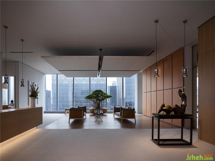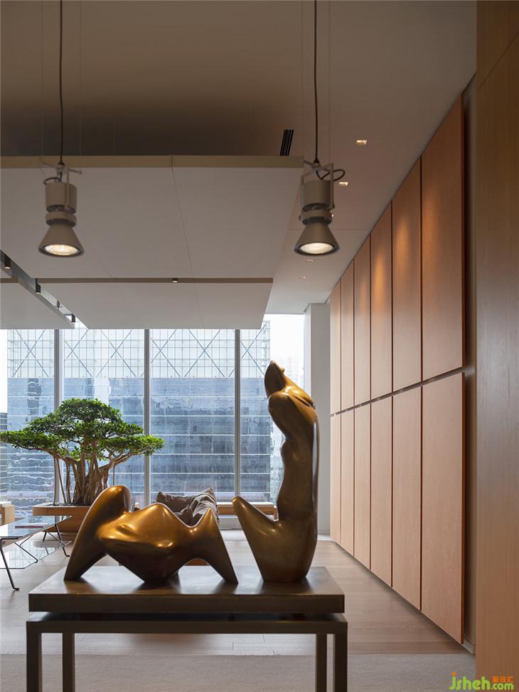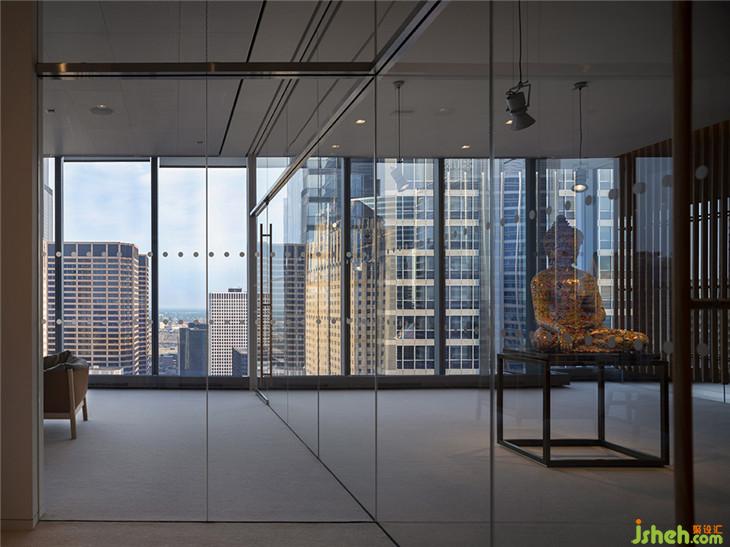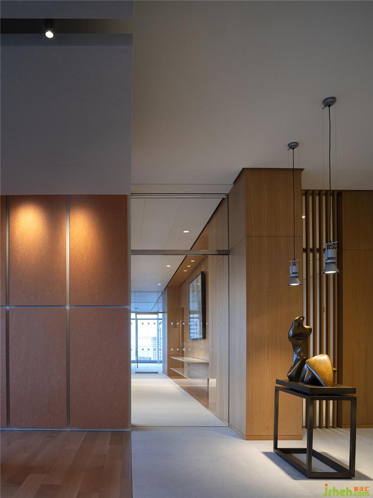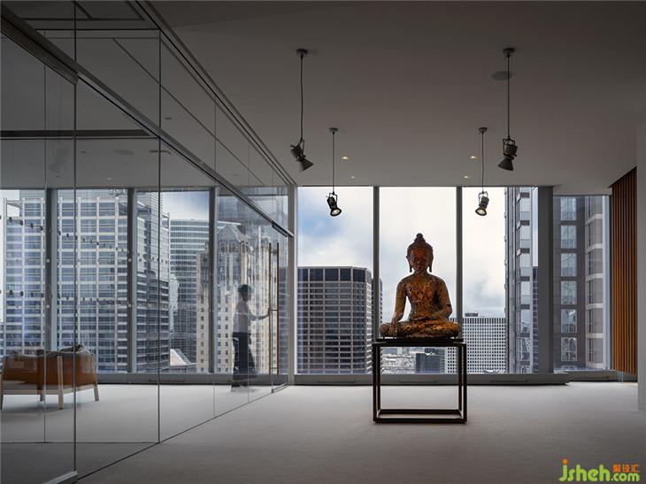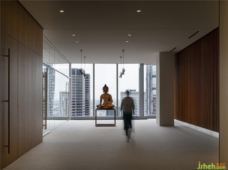建筑師Massimo Alvisi和Junko Kirimoto描述了當(dāng)你進(jìn)入該空間的體驗(yàn):“當(dāng)你離開(kāi)電梯,抵達(dá)32樓時(shí),你會(huì)感覺(jué)仿佛沉浸在城市里 - 在不同的高度角度來(lái)感受它。這正是我們?cè)谶@個(gè)空間中努力展現(xiàn)的城市的驚喜布局:我們漫步在當(dāng)代和東方藝術(shù)或考古學(xué)的作品中,偶爾會(huì)被強(qiáng)烈的色彩或摩天大樓不尋常的雙重高度所震驚,這些都是由墻壁、光線(xiàn)和視覺(jué)軸的緊密節(jié)奏所引導(dǎo)的。事實(shí)上,我們的第一反應(yīng)是讓角落保持自由,與城市保持持續(xù)的目光接觸“