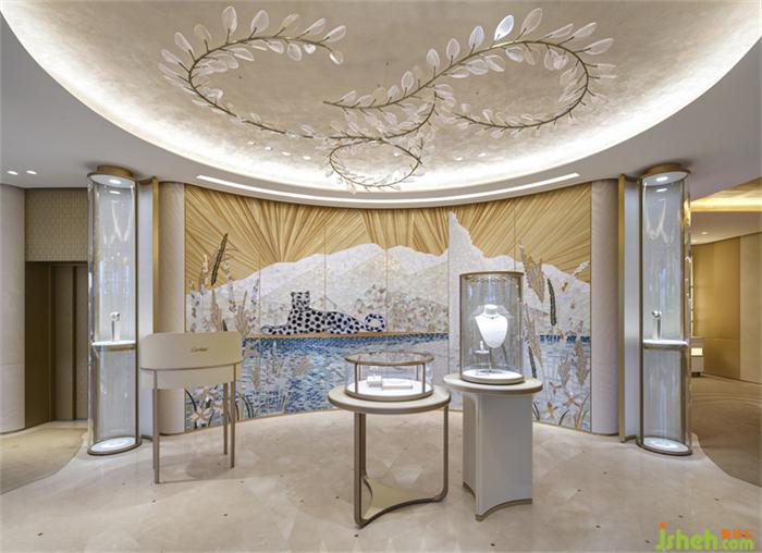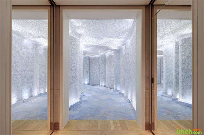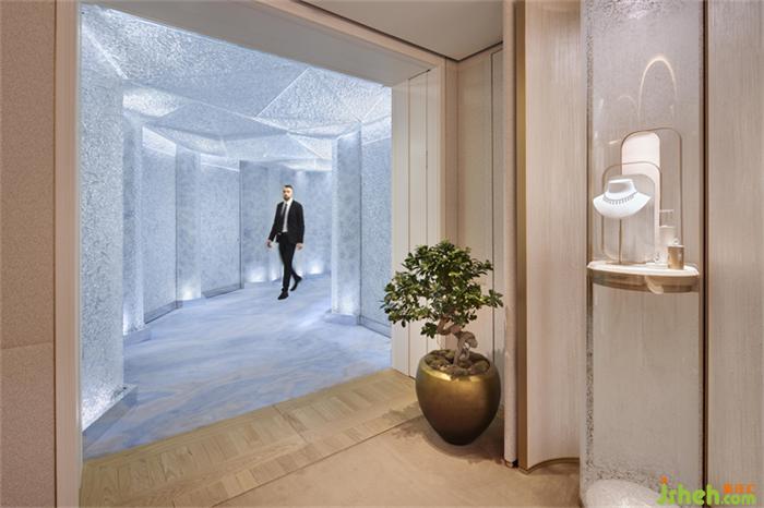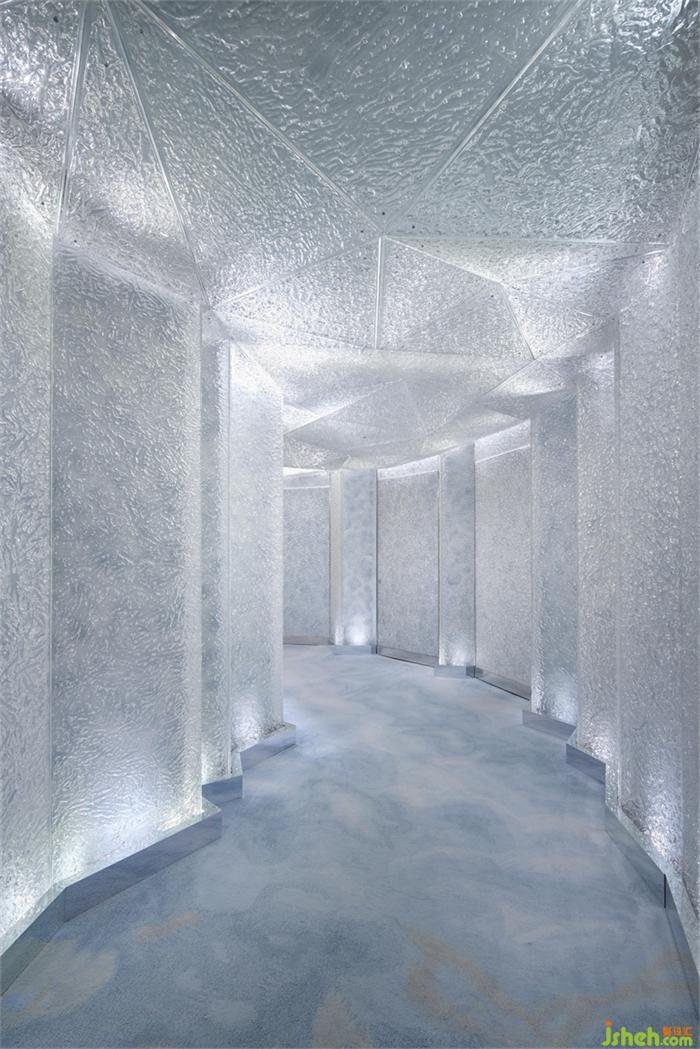 精品店的入口被水晶玻璃制作而成的冰墻所覆蓋,猶如踏入一座冰封千年的童話(huà)王國(guó),卡地亞精品店設(shè)計(jì)不規(guī)則的天花板和墻板渾然一體,像穿梭在冰川中,凌烈卻變幻莫測(cè)。