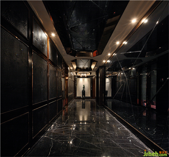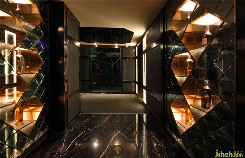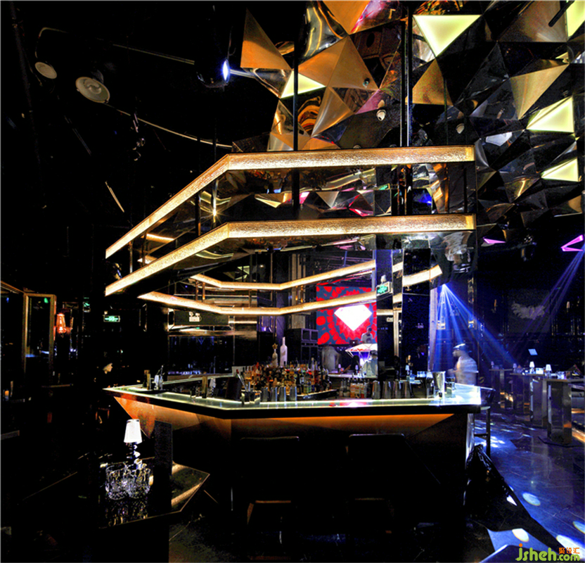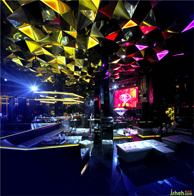 設(shè)計(jì)師把鉆石的形態(tài)元素分割出來(lái),用不同的材料,不同造型結(jié)合產(chǎn)生新的形態(tài)組合,或在天花,或是墻面,或是家具,又或是燈飾舞臺(tái)….無(wú)一不體現(xiàn)鉆石的時(shí)尚感。其中天花的LED造型燈飾是整個(gè)設(shè)計(jì)的亮點(diǎn),LED燈光和金色不銹鋼材料的層疊表現(xiàn)出不斷變化和色彩。