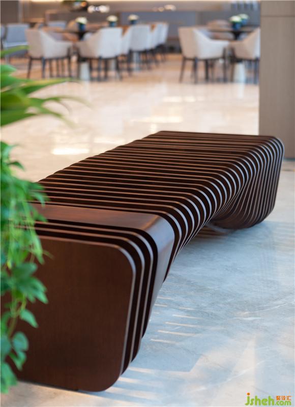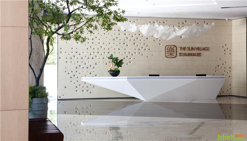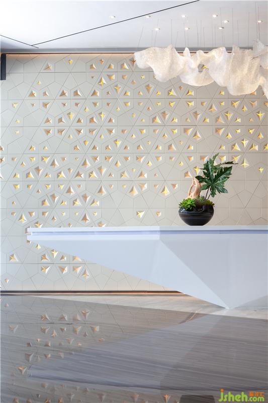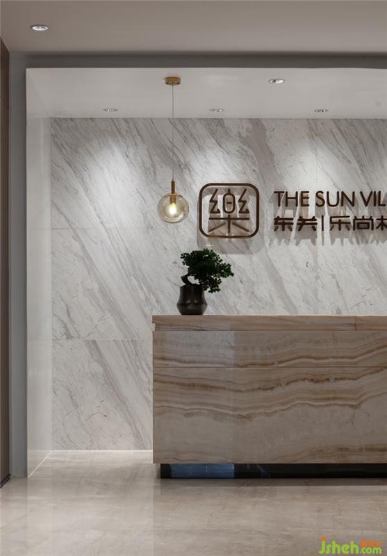 接待前臺(tái),從豎線條的林木抽象設(shè)計(jì)中轉(zhuǎn)入樹林疏影的抽象表達(dá),結(jié)合貝爾“有意味的形式”的藝術(shù)觀點(diǎn),讓視覺感知的外在形式引入到心理領(lǐng)域。接待臺(tái)似巨石,棱角分明。仰借云霧設(shè)計(jì)的吊燈,與瀑布般流水而下至地面的星墜大理石后壁融匯成縹緲的畫面。中間的沙盤,如古術(shù)叢林,置身在這有限的造林空間中。整個(gè)接待區(qū)的元素相互組合,實(shí)現(xiàn)了林中意境的視覺享受,頗有觀石聽水的自然心理快意。