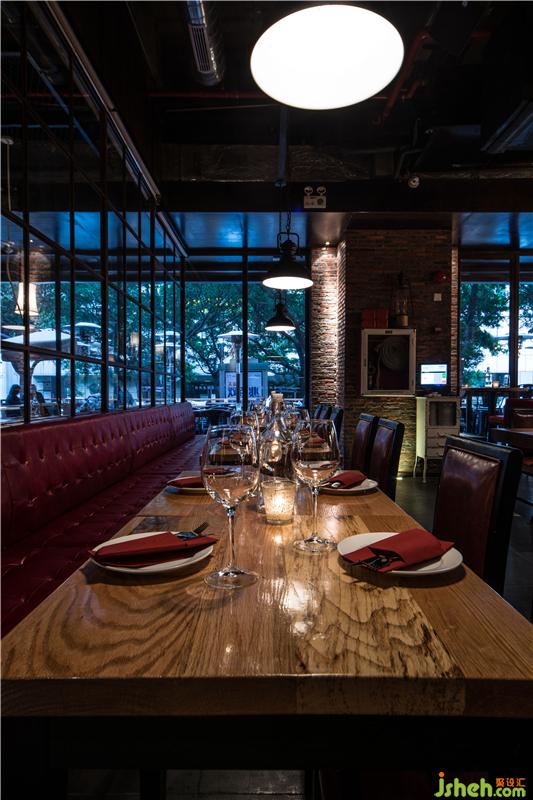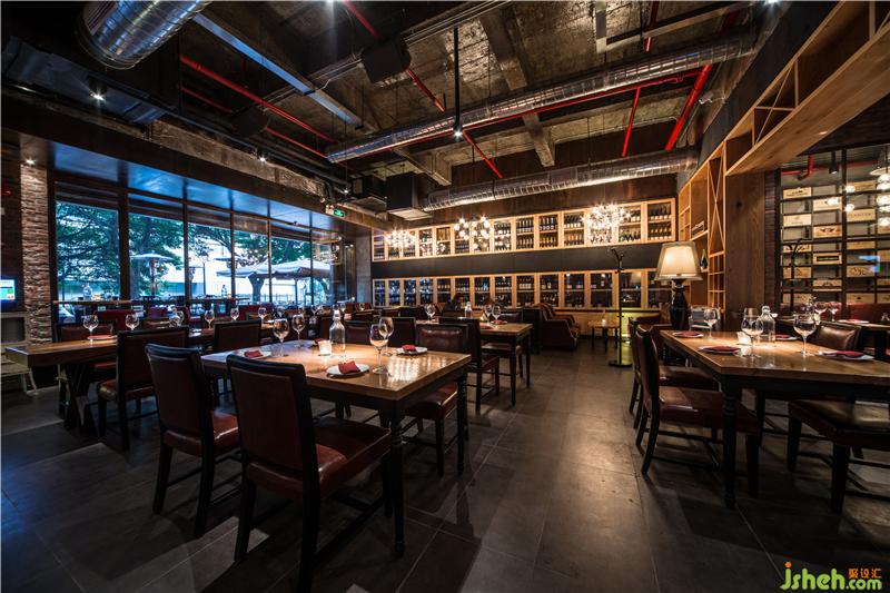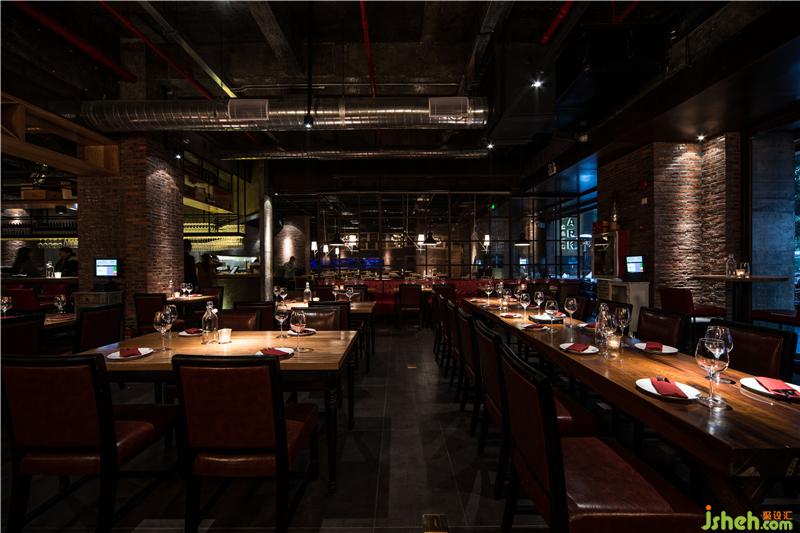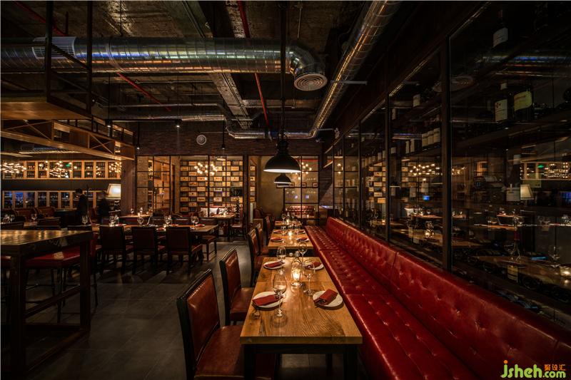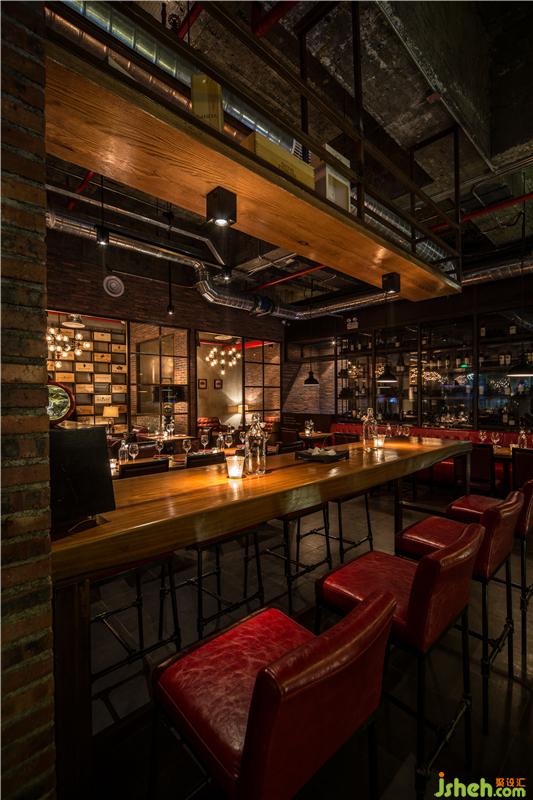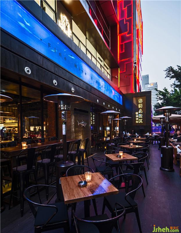 本案的設(shè)計(jì)概念意在打造一個(gè)“懷舊情懷”意式海鮮紅酒餐吧;設(shè)計(jì)師恢復(fù)了原建筑的混凝土肌理,以表達(dá)對(duì)一個(gè)空間歷史痕跡的懷念,空間的構(gòu)造簡(jiǎn)潔明快,銹板和紅磚很好地與原有的混凝土肌理結(jié)合在一起,加上空間上裸露的空調(diào)風(fēng)管和消防管,形成一種強(qiáng)烈濃郁的LOFT工業(yè)質(zhì)感。餐廳頂部設(shè)計(jì)師為了讓鯊魚在“天上”暢游,設(shè)計(jì)了一個(gè)16米長(zhǎng)大魚缸;讓客人在戶外用餐能有一個(gè)很特別的焦點(diǎn);而在觸摸到的實(shí)木臺(tái)面和酒柜和舒適有富有質(zhì)感皮革家具能給客人帶來一個(gè)溫暖而有品質(zhì)的用餐體驗(yàn)。