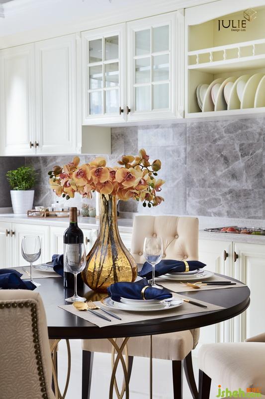 餐廳——“任這金色的陽光穿過耳畔,落在唇邊,那說不出的溫情如梵音,涓涓流淌在現(xiàn)代和簡美的淳淳合奏間”,設(shè)計公司在精致的餐盤配上橘色的裝飾玻璃花瓶,讓美美的色彩在餐廳,讓美味佳肴能更多幾分顏值。體現(xiàn)出業(yè)主對生活質(zhì)感的追求與向往。