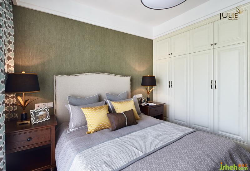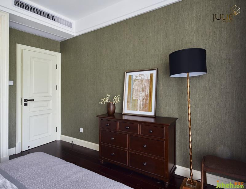 父母房——設(shè)計公司設(shè)計帶有溫暖和寧靜的氣息,深綠色墻紙配上白色床品,相互協(xié)調(diào)。