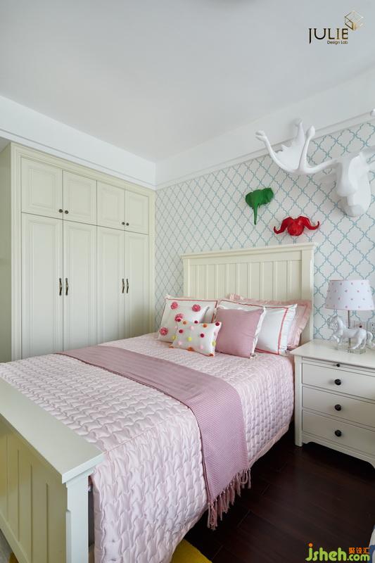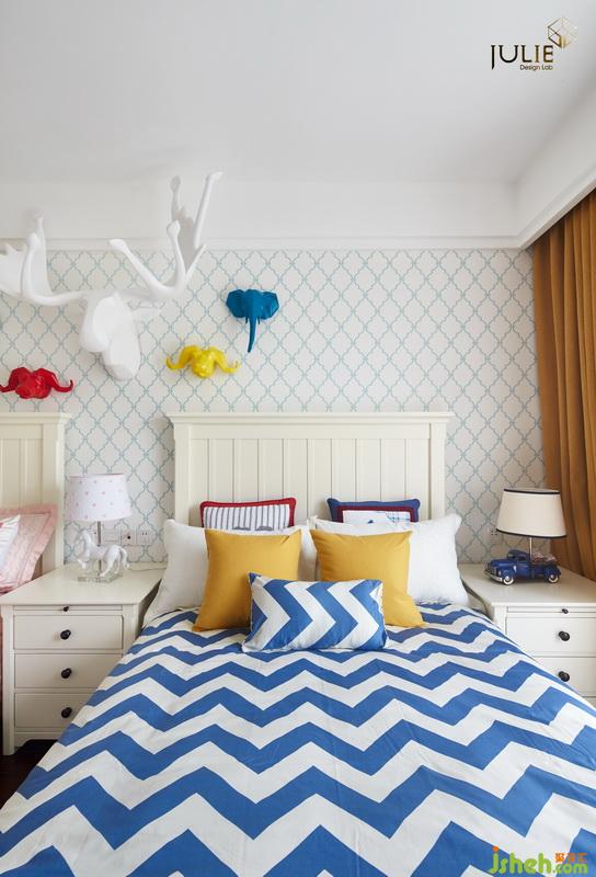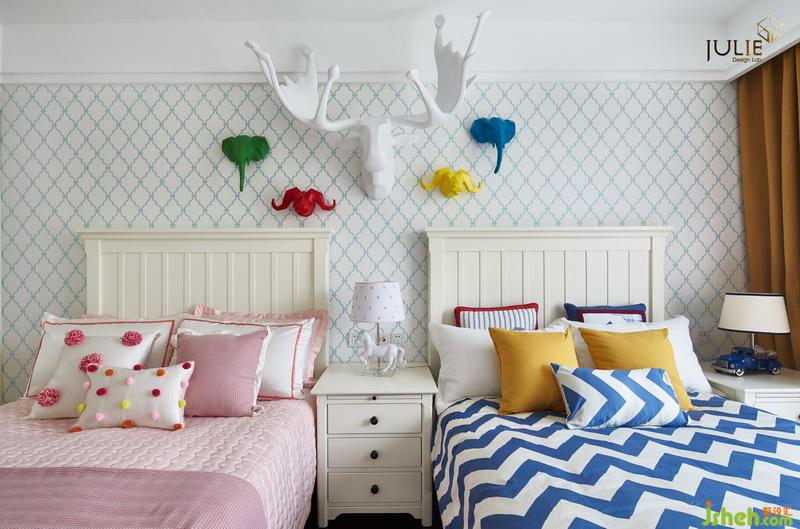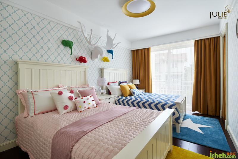 兒童房——明亮跳躍的讓人享受童話般的美妙觀感。設(shè)計公司將床頭白鹿為主,多彩象為輔?;顫婌`動著寓意孩子們能健康快樂的成長。