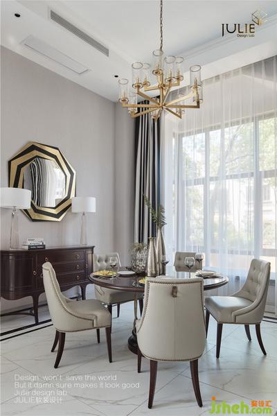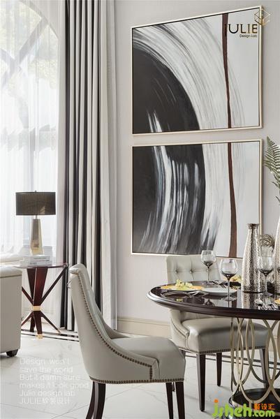 轉(zhuǎn)身進入中餐廳,圓形木質(zhì)金屬餐桌,搭配皮質(zhì)鉚釘餐椅,穩(wěn)重中不失大氣??臻g中經(jīng)典的黑白色相間的窗簾和裝飾配畫,讓整體空間層次感更加豐富。