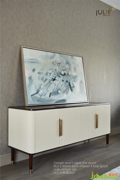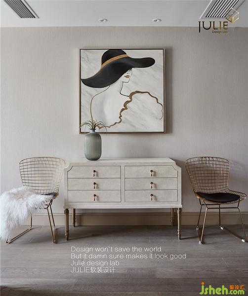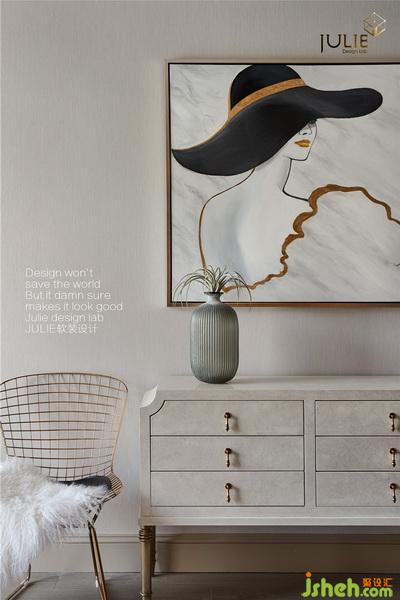 三樓玄關(guān)過(guò)道空間的休息平臺(tái),小端景出采用人物裝飾畫(huà)搭配金屬質(zhì)感的休息椅,美觀與實(shí)用結(jié)合的玄關(guān)柜。無(wú)不體現(xiàn)出居住者品味精致生活的小細(xì)節(jié)。