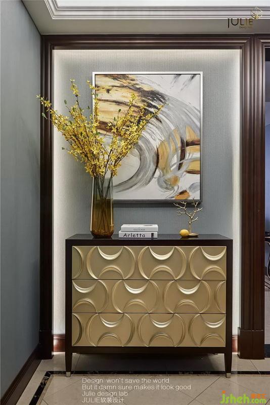 一進(jìn)門就被整體帶入奢華氛圍,入戶門玄關(guān)柜造型靈動,為整體空間帶來流暢性。