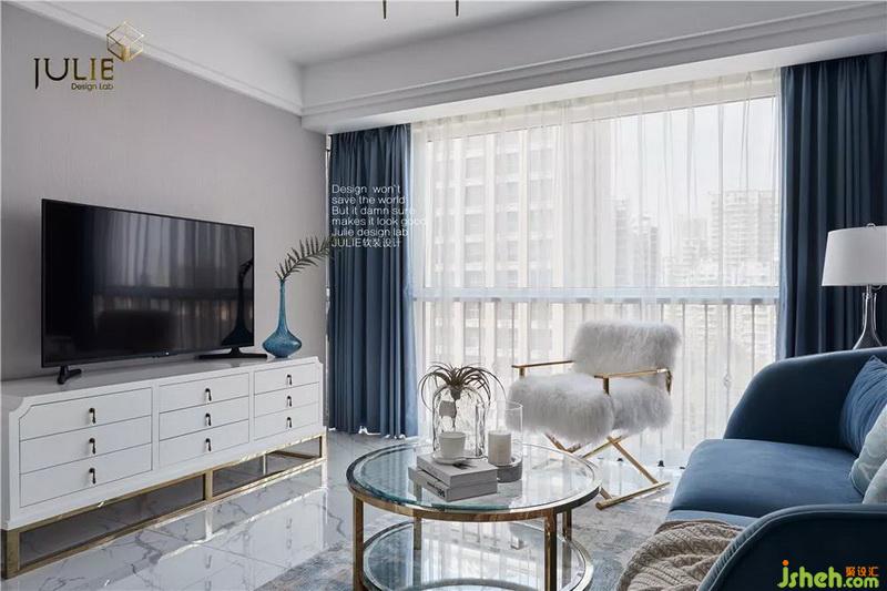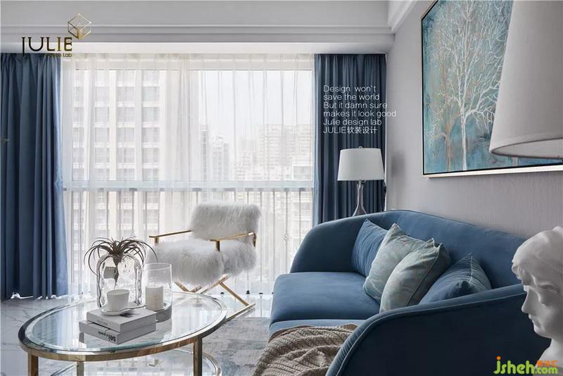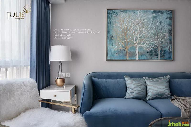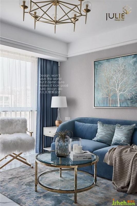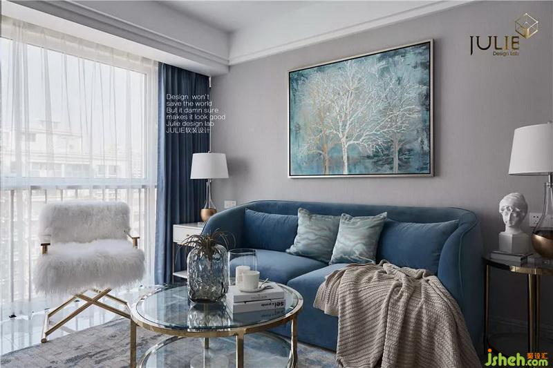 夢(mèng)幻藍(lán)的主色調(diào)室內(nèi)設(shè)計(jì)師加以金色點(diǎn)綴,將小居所的輕奢風(fēng)發(fā)揮到極致。客廳大大的落地窗,陽(yáng)光透過(guò)半透明的紗幔,讓居室中的光線多了一分柔和。撥開(kāi)層層的迷霧,油畫(huà)夢(mèng)幻森林的意境更加若隱若現(xiàn)。
