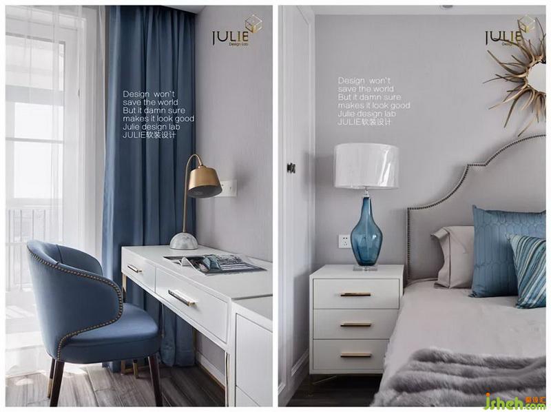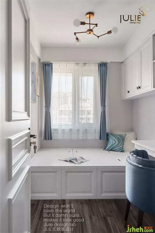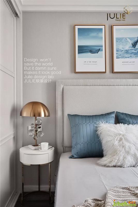 簡約的布藝床背,融合空間整體大色系,輕巧時尚的玻璃球為小空間增添些許層次。