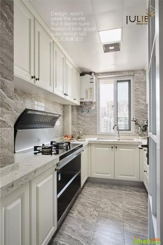 流水狀瓷磚整體統(tǒng)一,搭配淺色櫥柜整體效果簡約大氣。