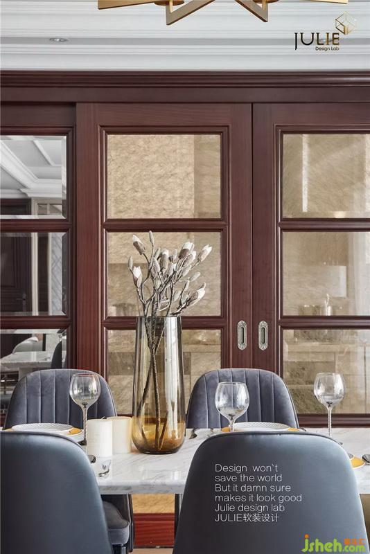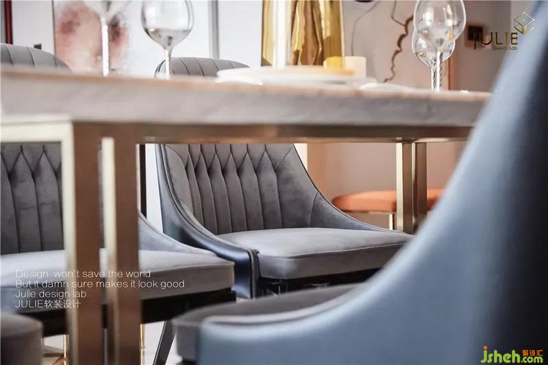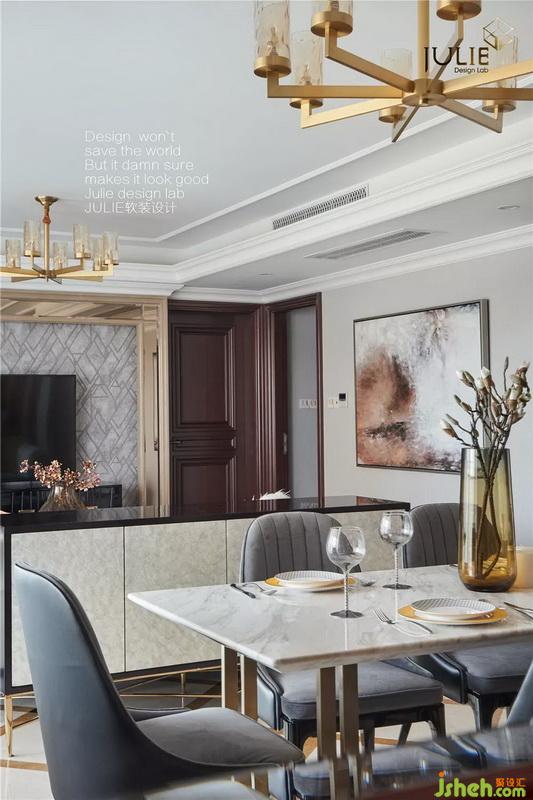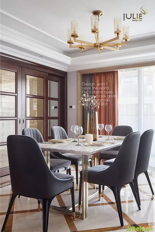 室內設計師款大理石臺面金屬餐桌款式簡單時尚,餐邊柜采用貝殼狀肌理,整體層次多樣。絨面餐椅皮質包裹,細節(jié)精巧細膩,值得慢慢推敲。