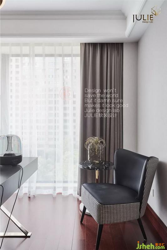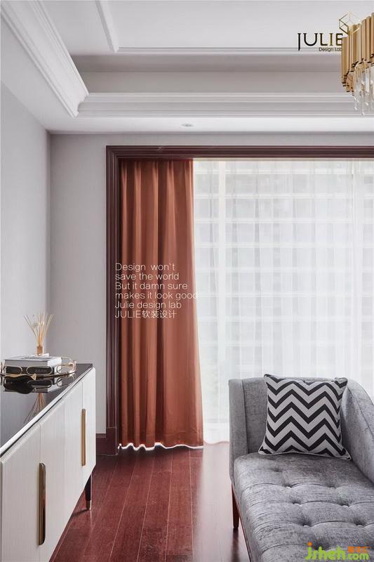 更換原有精裝基礎的菱形土色硬包造型,淺灰色硬裝鑲嵌銅條造型,為整體空間增色不少。橙赫色窗簾和小抱枕點綴,增添一絲靚麗活躍。