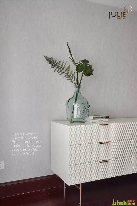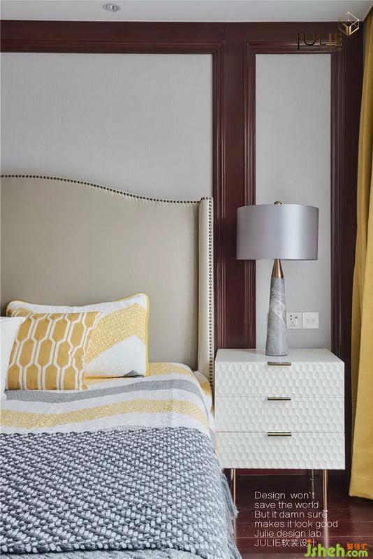 如何在原有深色木作背景上軟裝整體空間?我們室內設計師采用淺色的布藝軟包床,六邊形拼間的淺白色床頭柜和斗柜為一系列。采用陽光般溫暖的黃色系點亮空間。