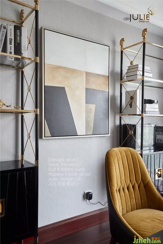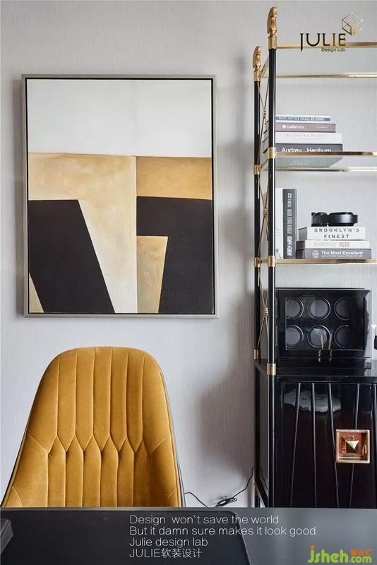 輕奢時尚造型的書柜為整體吸引眼球,暖色系書椅和掛畫點綴空間感。幾何黑白造型的休閑椅和灰色窗簾,更是增添了幾分穩(wěn)重氣息。