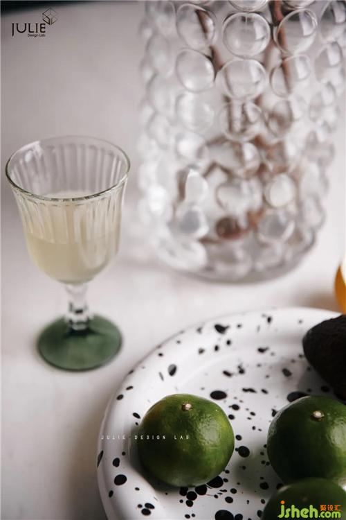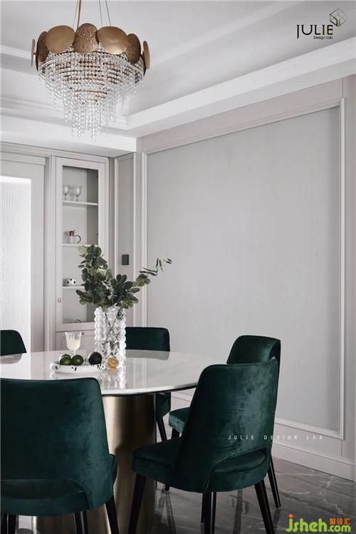 天然大理石與金屬相結(jié)合的餐桌,糅合細(xì)膩的復(fù)古工業(yè)風(fēng),另外搭配與客廳相呼應(yīng)的墨綠色餐椅,在自然光影的氛圍下很有電影畫面感,儀式感十足。