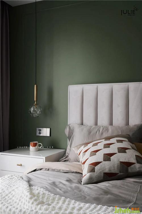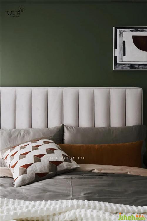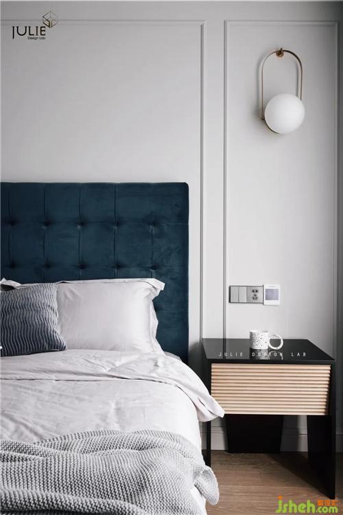 The wall of the master bedroom is decorated with simple lines, and then the bed with haze blue fills the whole space. The artistic style is just right and the space is exquisite. In the night, two exquisite and small wall lamps will be lit, slowly reshaping the tenderness of the space.
