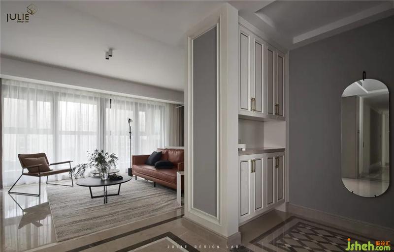焦糖色皮沙發(fā)搭配灰色圈絨羊毛地毯。杭州裝修設(shè)計(jì)藝術(shù)小人像被安置在吧臺(tái)旁的臺(tái)面上、簡(jiǎn)單卻有點(diǎn)晴的效果。