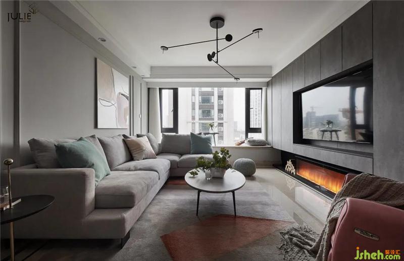 深灰的電視墻包裹電視融于客廳背景