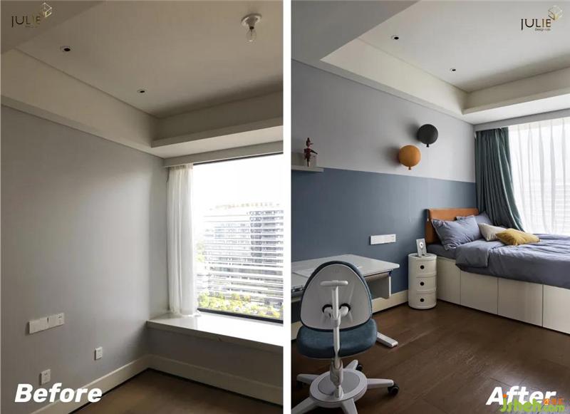 色調(diào)和江景的呼應(yīng),每天光是看著就很賞心悅目。收納設(shè)計(jì)超級(jí)贊,空間利用率高才能保證家里始終整潔如一??团P翻板床簡(jiǎn)直是神來(lái)之筆,娃每天在里面搭樂(lè)高,玩得樂(lè)不可支。