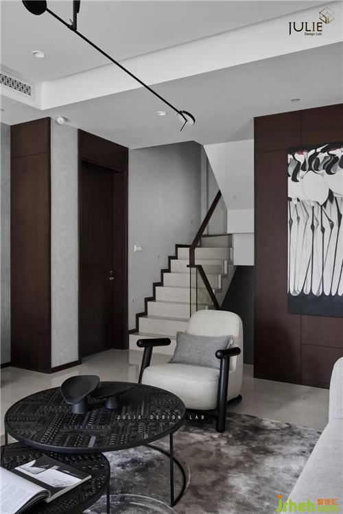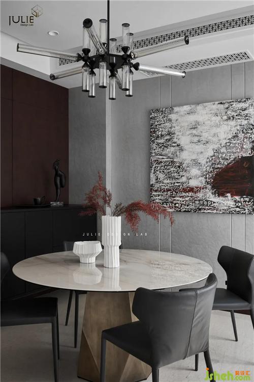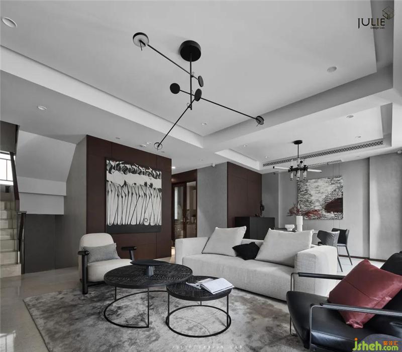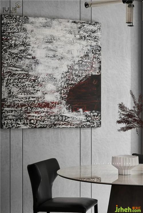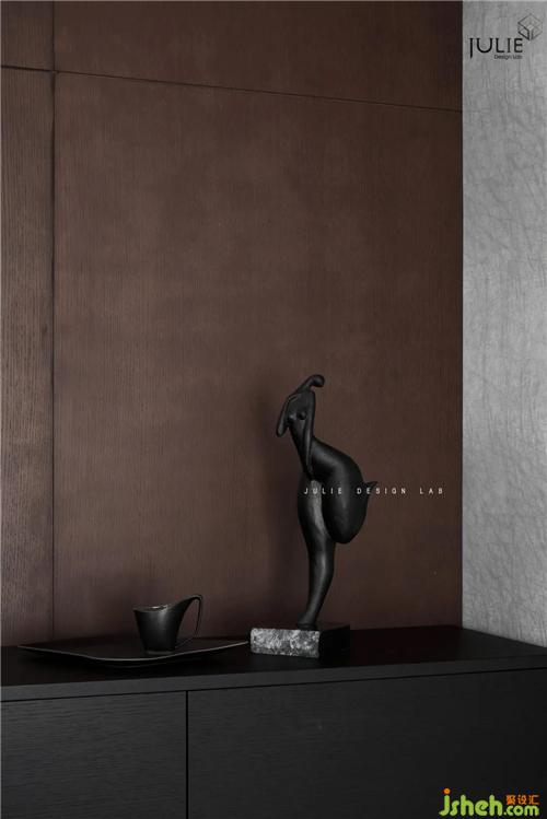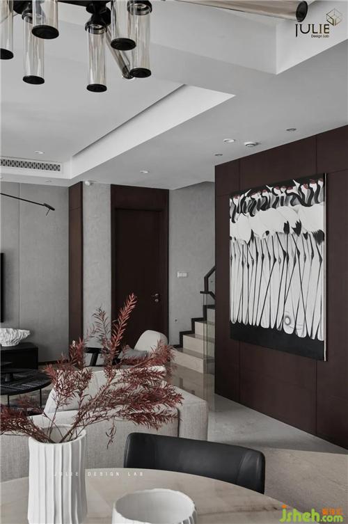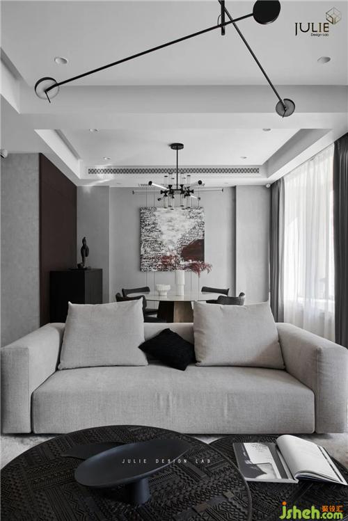 客廳整個(gè)空間的基調(diào)以典雅灰與白茶色為主。白茶色,在印象之中是溫暖而含蓄的,這樣的色彩與黑色進(jìn)行碰撞,于空間中娓娓道來,單單在感官上就能引起所有的注意力。