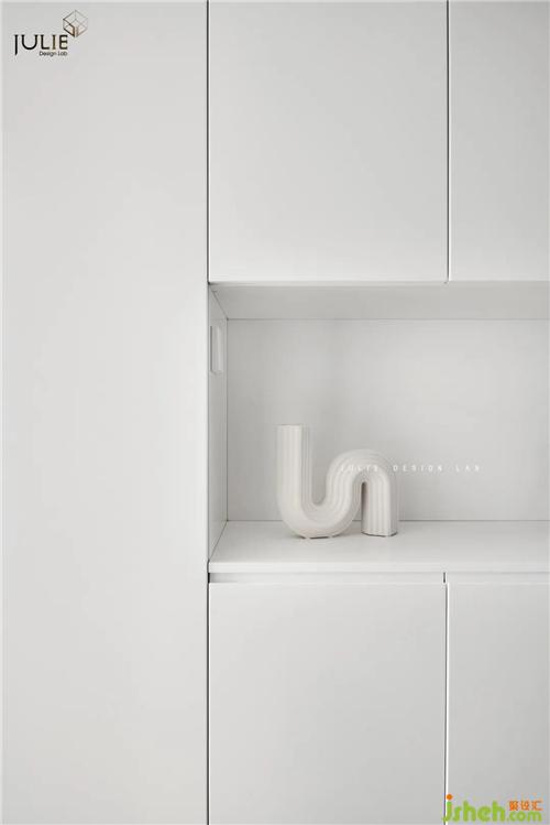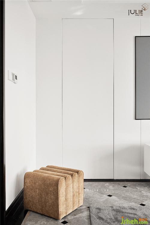 In order to avoid the door breaking the integral sense of TV background wall, an invisible door is designed here. In a leisurely afternoon, three or five friends have a rest. The laser projection is playing a movie on the 100 inch screen. Everyone can enjoy the pleasure and achieve the poetic of the overall situation of the space.