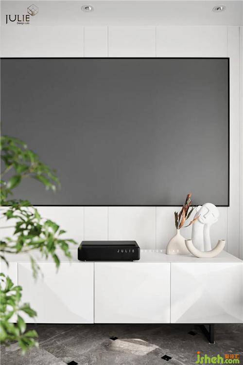 為了避免次臥門打破電視背景墻的整體感,在此設計了隱形門。悠閑午后,三五好友相約而憩,激光投影在100寸的屏幕上播放著電影,大家一起享受這愜意時光,成就了空間整體情境的詩意化。