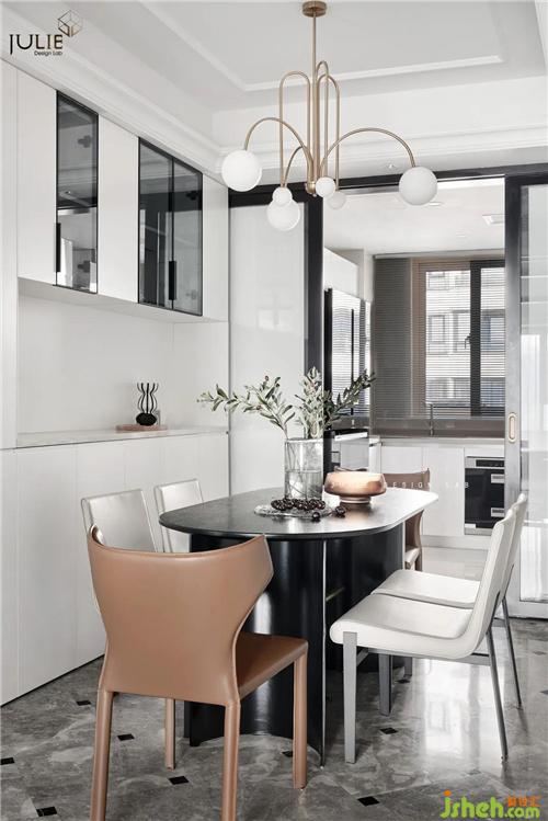 餐廳位于玄關(guān)右側(cè)方,客廳和廚房光線的融入讓整個(gè)空間的視覺(jué)光線更加明亮。杭州裝修設(shè)計(jì)方圓型的黑色餐桌搭配橙色及淺灰色的餐椅和客廳的配色相互呼應(yīng),透露著設(shè)計(jì)師優(yōu)美極簡(jiǎn)的設(shè)計(jì)概念。