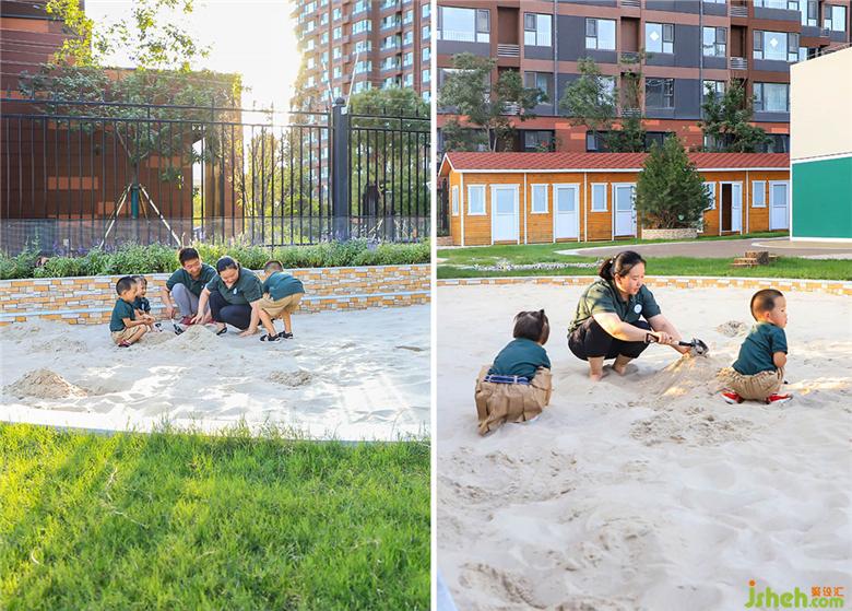 幼兒園設(shè)計園所戶外設(shè)置了“沙池”,午后暖洋洋的陽光下,老師帶著孩子感受自然的美好。