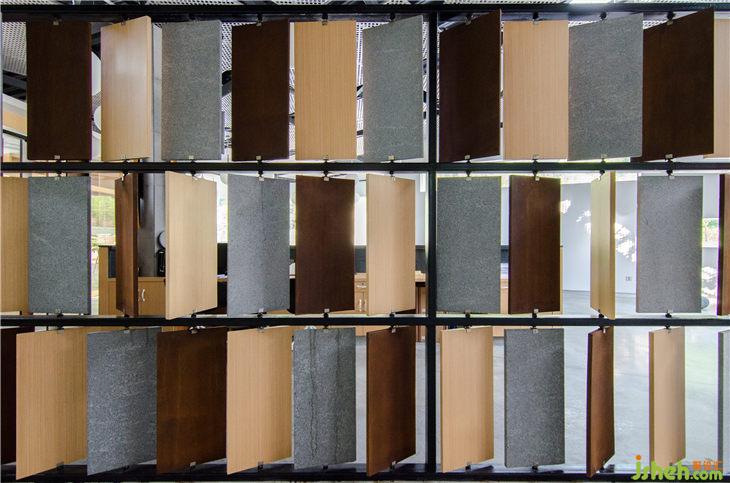 服務(wù)臺屏風(fēng)采用了三種空間主要材料來制作,將材料加工為固定規(guī)格并在上下中軸部位安裝轉(zhuǎn)軸配件,使其可以在金屬屏風(fēng)層架中360度任意旋轉(zhuǎn),增加趣味性的同時也增強了人與空間的互動。