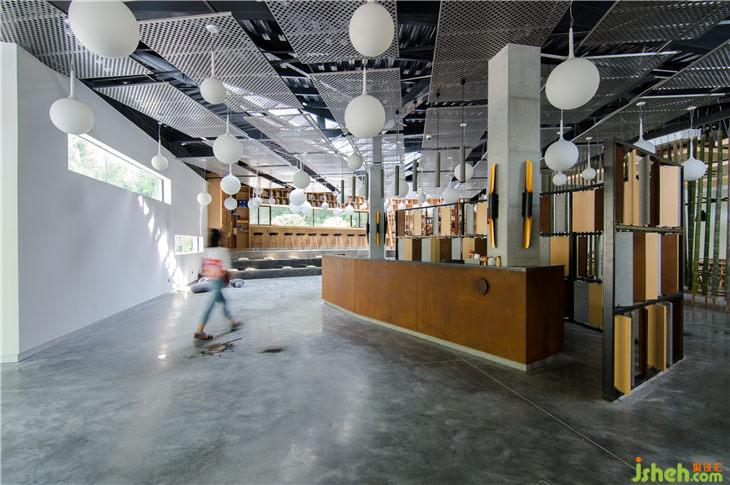開放餐廳有兩根原始鋼結(jié)構(gòu)柱呈東西向布置,我們在兩根柱間將就地取材的天然竹子用鋼索吊裝于天花板上部形成隔斷,竹子底部則成曲線形懸空。清風(fēng)徐來,翠竹微擺也別有一番情趣。