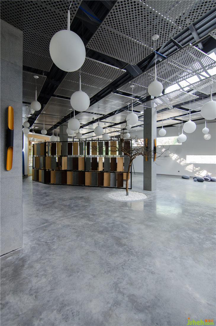室內(nèi)頂面穿孔金屬板將無序的天花結(jié)構(gòu)及管線設(shè)施在視覺上做了一個整理,既讓天花能形成良好的統(tǒng)一感,又不妨礙頂部的采光天窗將光線引進室內(nèi),圓孔的處理在室內(nèi)形成了特殊的光影效果。銀色的反光金屬板材質(zhì)在視覺上也具有輕盈性。以此可在空間上建立起一種新的秩序。