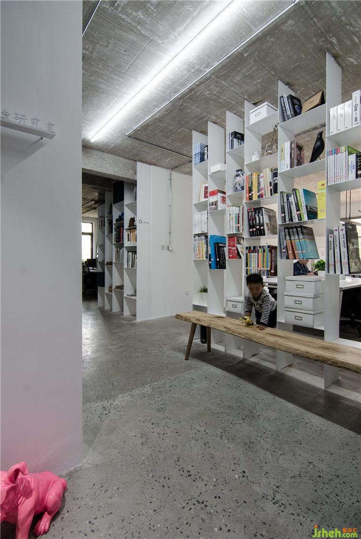 走廊南側(cè)則是用鋼板裁切現(xiàn)場(chǎng)焊制的書架。作為工作室的圖書區(qū)來(lái)使用??梢栽谧L(zhǎng)凳上閱讀。