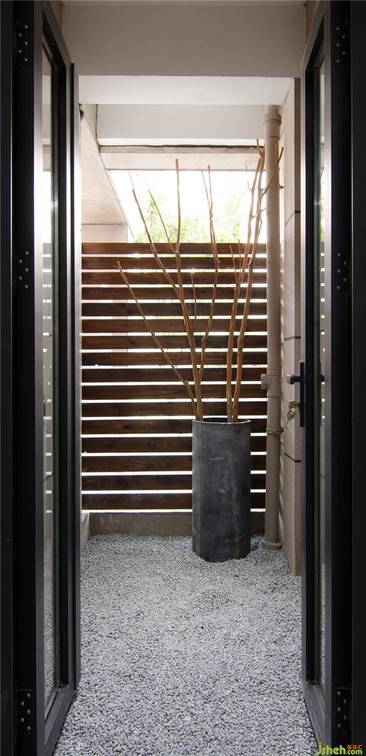北側(cè)的小陽(yáng)臺(tái)將原工作室的景觀石子搬過(guò)來(lái),外面用防腐木做了遮擋,保證隱私的情況下又能讓部分光線透入。