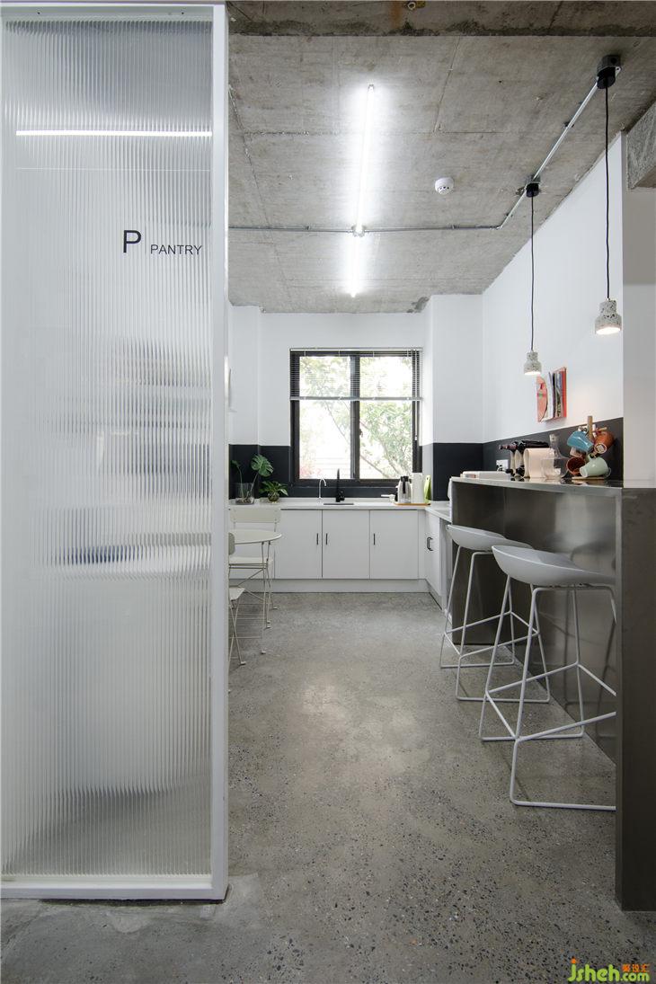 在茶水間與會(huì)議室之間的吧臺(tái)既起到了功能分界的作用,卻也模糊了兩個(gè)功能區(qū)的邊界,營(yíng)造出一種有意識(shí)的空間巧合。