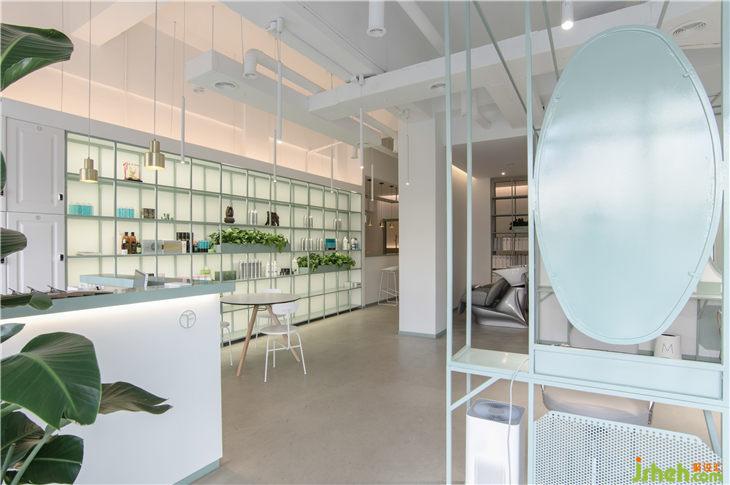 開放式的陳列架除了起到區(qū)分功能的作用外,也承擔(dān)了大多數(shù)空間的收納需求,接待區(qū)主要陳是美容美發(fā)護(hù)膚產(chǎn)品。洗發(fā)區(qū)旁邊的展架則收納了VIP顧客的個(gè)人洗護(hù)發(fā)用品,并在架上設(shè)置了毛巾儲(chǔ)藏柜和使用過的毛巾投放孔。陳列架都分布在對(duì)應(yīng)功能區(qū)的流線上,滿足了工作人員的便捷操作。