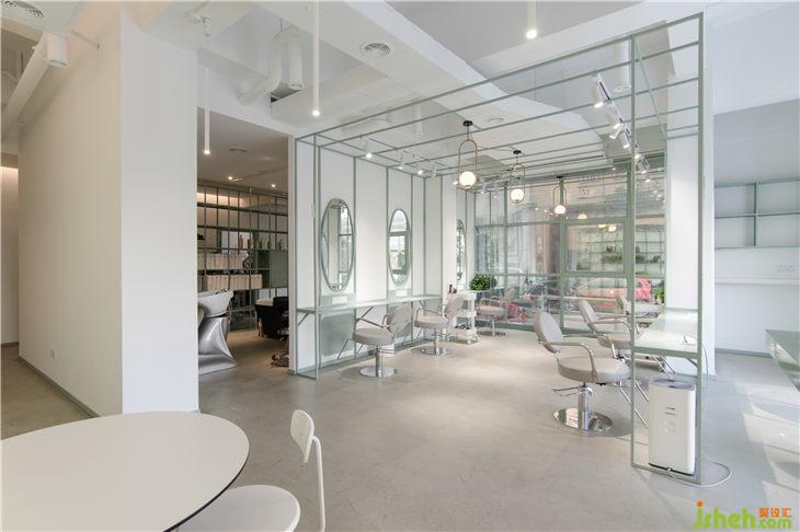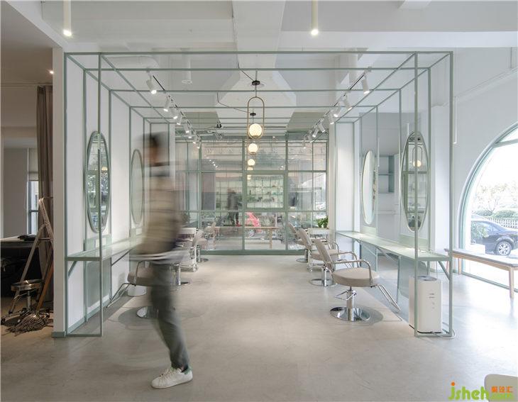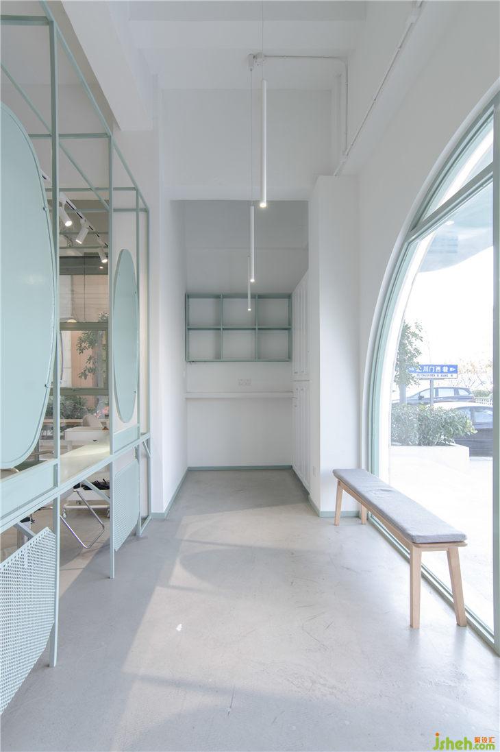 老建筑空間的柱子較多,由于對(duì)空間柱子的運(yùn)用不當(dāng),導(dǎo)致原有空間功能尺度分布欠佳,使得視覺上顯得十分擁擠狹窄。為了避免這種情形,我們有效利用了公共空間面積,將新的功能與大廳的柱子做了整合,自然的弱化了柱體對(duì)空間造成的擁堵感。另外我們采用了金屬構(gòu)架建立了美發(fā)區(qū)的功能邊界,既可以讓功能得以區(qū)分,又能在視覺上形成通透性,擴(kuò)大空間的視覺感。
