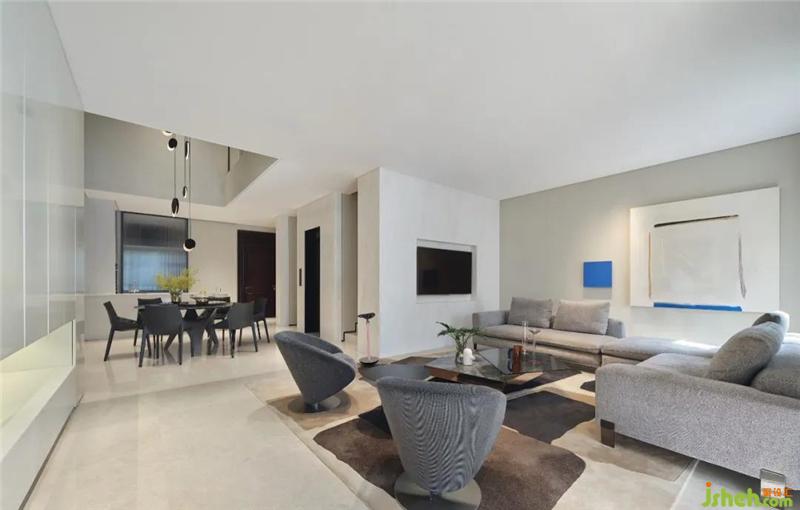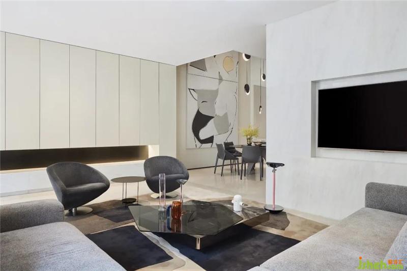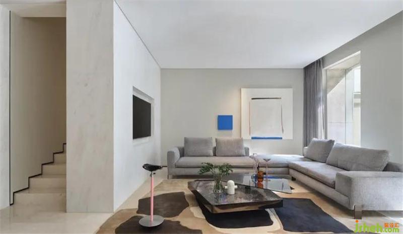 以優(yōu)雅的白色與米灰色鋪陳了整個空間的基底。高聳的挑空里,抽象畫作為空間注入十足的藝術氣息。