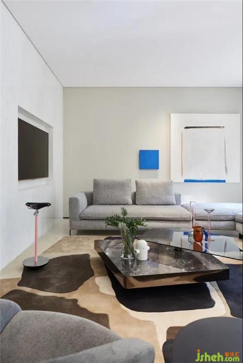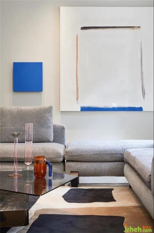 客廳墻上一大一小的極簡主義畫作頗有幾分藝術家方塔納的作品格調,幾支線條上的色彩分別點染著茶幾上的玻璃器皿。地毯上的碎石塊圖樣也在呼應著沙發(fā)與墻壁的配色,一切和諧而不乏生動性。