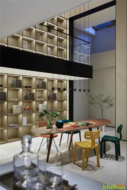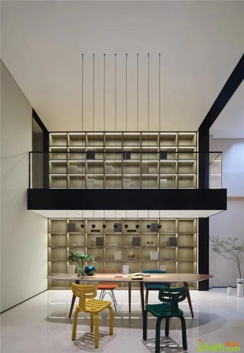 設(shè)計(jì)師以貫穿墻面的書(shū)柜營(yíng)造整體而統(tǒng)一的視覺(jué)性,暖色木飾面在燈光的映襯下為空間增添溫度,黑色啞光金屬線條從中勾勒出空間的立體感。