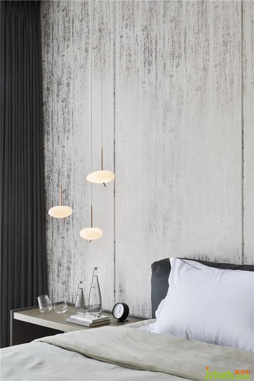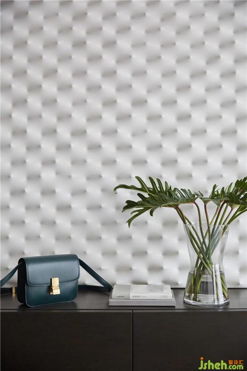 晨曦或午后,光線從白色紗簾穿透到室內(nèi),采用V字金屬條分割的壁布上,肌理閃爍著微光,細(xì)膩而美妙,高級(jí)感呼之欲出。整個(gè)場(chǎng)域都在映射著一種珍貴的品格,鏡像出居住者的內(nèi)心世界。