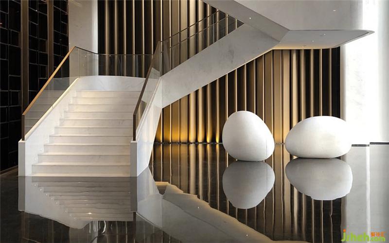 酒店空間描述遵循圓為動,方為靜的傳統(tǒng)哲學觀念??臻g環(huán)境追求“天人合一” 的境界,所有玲瓏剔透的巧思,巧奪天工的設(shè)計,都是為了人與環(huán)境的完美結(jié)合,讓客人在藝術(shù)審美中感受生活的寧謐,遠離喧囂擁擠,在這里放空自己,無限享受和諧的美好。酒店以水為主題,水的意境,水影、水滴、水泡、波瀾起伏的水浪背景與客人形成內(nèi)心深處情感的連結(jié)。用色方面,遵循傳統(tǒng)五行文化的“黑為水”邏輯,拒絕膚淺的裝飾手法,不迎合潮流和趨勢。通過主要材料:爵士白石材、皇家啡石材、古銅板、古銅拉絲、水晶、演譯一場“水”的故事。