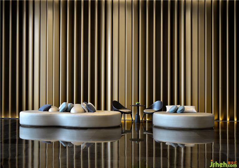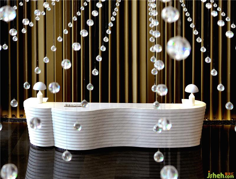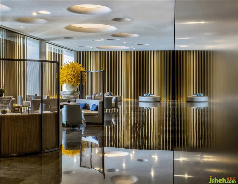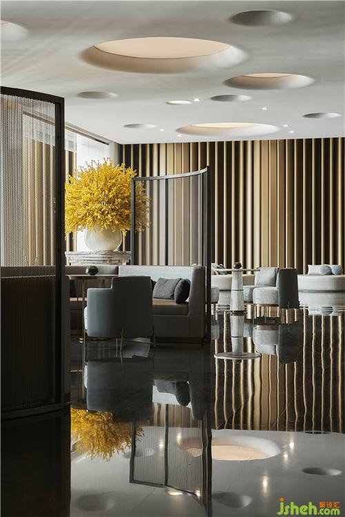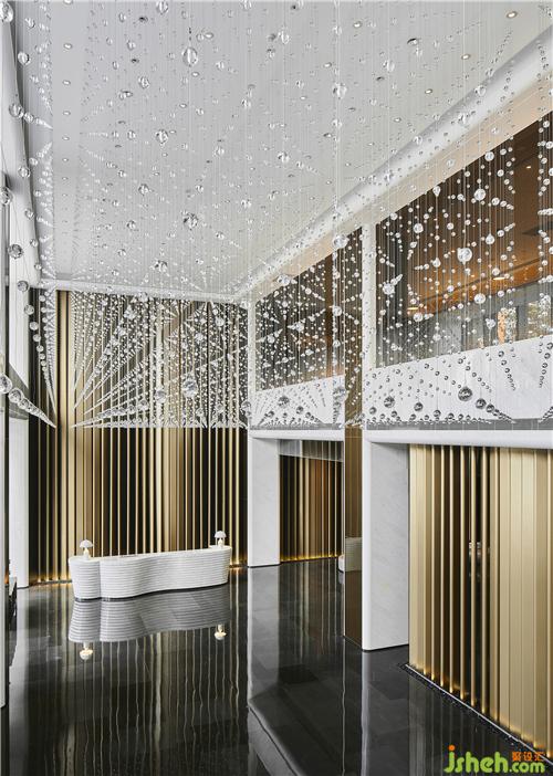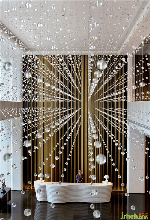 酒店大堂就像一篇優(yōu)秀文章的一個強有力的開端,以熱情而優(yōu)雅的方式歡迎每位客人的到來,并且開門見山直入主題,將酒店的水主題向每位客人緩緩展開。酒店設(shè)計象征著波瀾起伏水浪的墻面,水浪形狀的服務臺,以水泡形式呈現(xiàn)的大堂吧天花,象征雨點的大堂水晶藝術(shù)吊燈、水滴形態(tài)的沙發(fā)、水漣漪的大堂吧家具、水岸邊的鵝卵石、倒影……把酒店的水主題意境演譯得生動有趣、惟妙惟肖。酒店的空間路徑都預設(shè)對比及懸念,不同的點有不同的感受,整個路徑連起來就是一趟驚喜不斷的體驗過程。入口處由小變大,由低變高,由暗變亮,先抑后揚,就如東晉陶淵明的《桃花源記》:林盡水源,便得一山,山有小口,仿佛若有光。便舍船,從口入。初極狹,才通人。復行數(shù)十步,豁然開朗……
