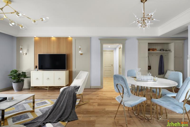 本案是以藍(lán)灰和米灰作為主色調(diào)的,藍(lán)灰的墻面,米灰的木飾面和木門,搭配起來相比單純冷淡的灰色多了些許暖意。金色元素比較多,是以輕奢風(fēng)為主題。輕奢是一種新時尚的理念,展示了屋主的品味。