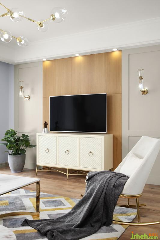 室內(nèi)設(shè)計師把電視背景墻做了原木色,與米灰的護墻板、米色的電視柜很自然的協(xié)調(diào)在一起。電視柜上精致的金色圓環(huán)拉手,寓意圓滿,一起喚醒生活中的美妙。